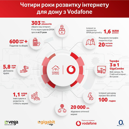 У межах групи компаній Vodafone Україна проєкти з розвитку фіксованого інтернету реалізує національний оператор Vega. Він відповідає за будівництво, модернізацію й обслуговування інфраструктури, а також упровадження інноваційних технологій.