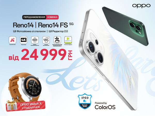 З 13 по 24 серпня 2025 року, моделі Reno14 5G (12/256 ГБ) та Reno14 FS 5G (12/512 ГБ) можна замовити за цінами від 24 999 грн та отримати у подарунок смартгодинник OPPO Watch X.