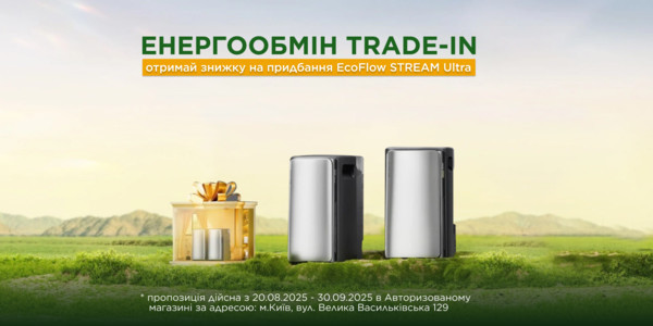 З 20 серпня по 30 вересня 2025 року включно в єдиному офлайн Авторизованому роздрібному магазині EcoFlow у Києві ви можете обміняти свою портативну зарядну станцію серій RIVER / RIVER 2 або DELTA / DELTA 2 на знижку до 10 000 грн при покупці системи енергозабезпечення EcoFlow STREAM Ultra або комплекту, що включає цю систему.