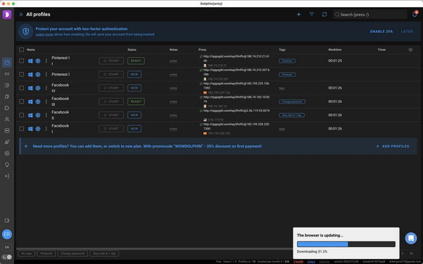 Кроме того, Dolphin Anty позволяет легко интегрировать и управлять различными типами прокси-серверов (HTTP, HTTPS, SOCKS5, SSH). Это дает возможность имитировать доступ к интернету из разных географических локаций.